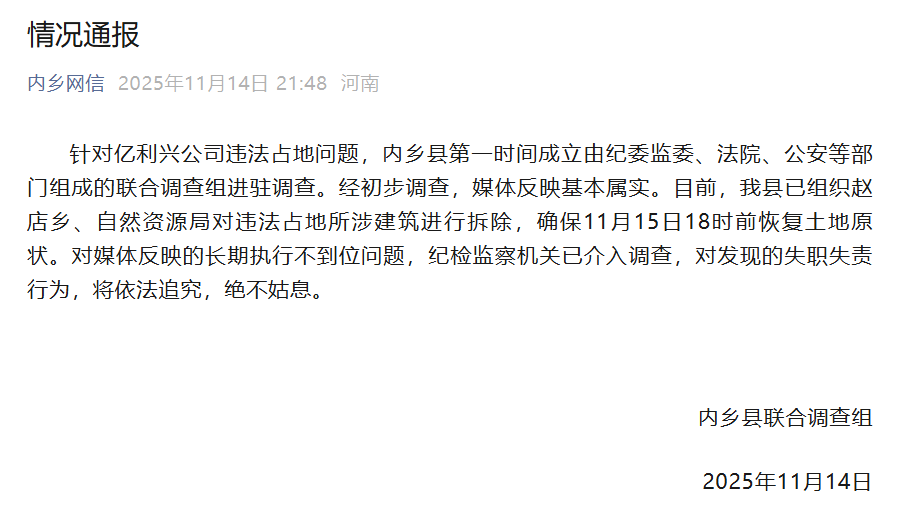 11月14日晚,河南省南阳市内乡县联合调查组情况通报: