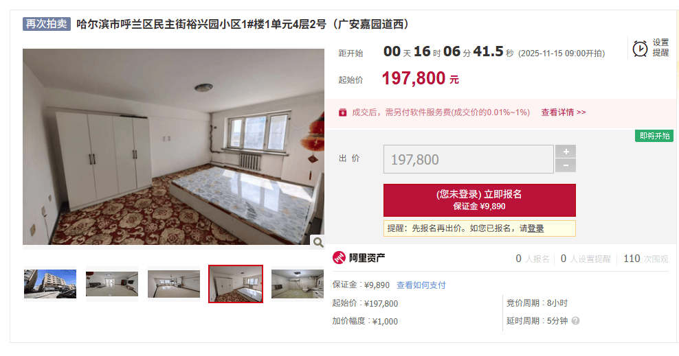 以哈尔滨裕兴园小区一套105㎡左右的房产为例,这套房子由黑龙江木兰农村商业银行发起拍卖,起拍价为19.78万元,低于市场均价54%,属于抵债资产。