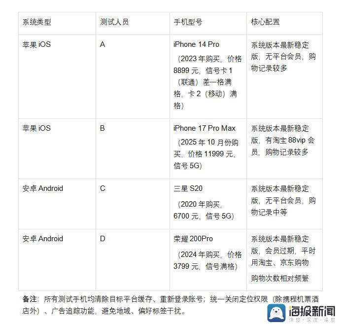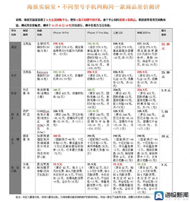 11月10日13时,海报实验室启动专项测评,选取淘宝、京东、抖音、拼多多、去哪儿、淘宝闪购6大主流网购平台,以iPhone 14 Pro(以下简称iPhone 14 P)、iPhone 17 Pro Max(以下简称iPhone 17 PM)、三星S20、荣耀200Pro四款机型为测试载体,模拟普通消费者真实购物场景,对日用品、生活服务、旅游等6类商品同步比价,同款商品的价格对比在10分钟内完成,试图揭开“设备价差”的面纱。