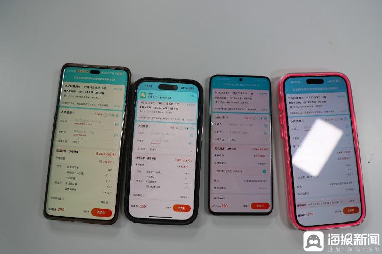 以在“去哪儿平台”订酒店为例,四款手机同时搜索杭州11月22日至11月23日周日1晚的酒店,大家发现,如家商旅酒店(杭州西湖湖滨音乐喷泉店)商务大床房的价格不尽相同,iPhone 14 P实付金额300元,其余三款手机实付金额为290元,差价10元。
