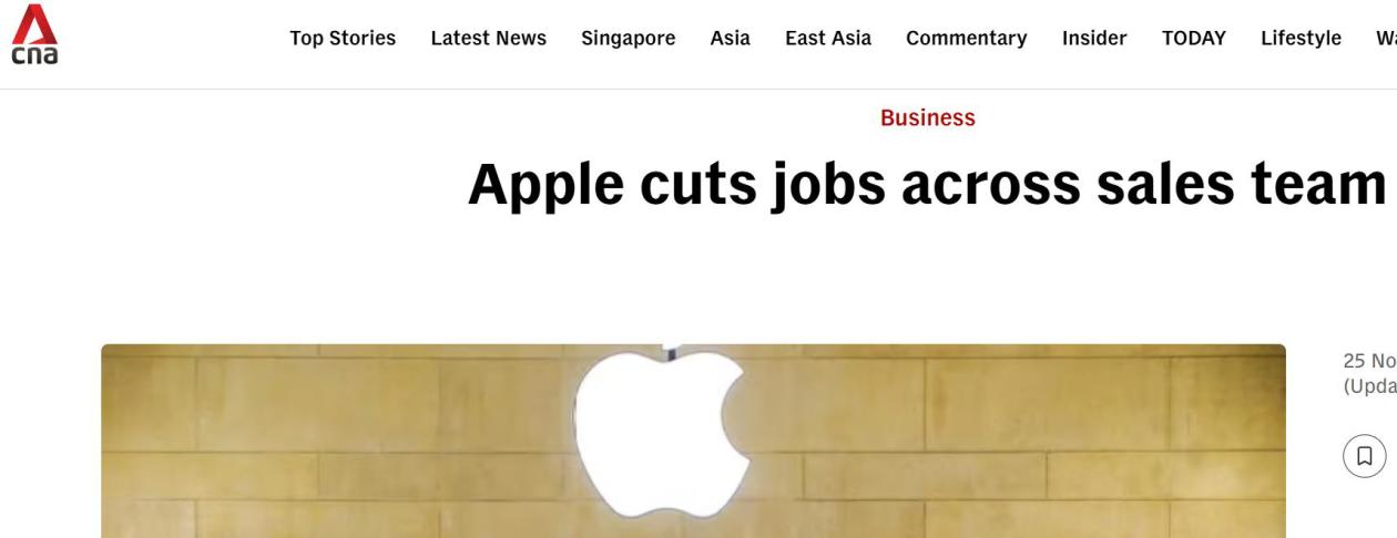 11月26日消息,据cna援引路透社报道称,苹果公司为“强化客户互动效率”,已裁减面向大型企业、教育机构及政府机构的少量销售职位,并同步缩减负责产品演示的Briefing Center运营团队。