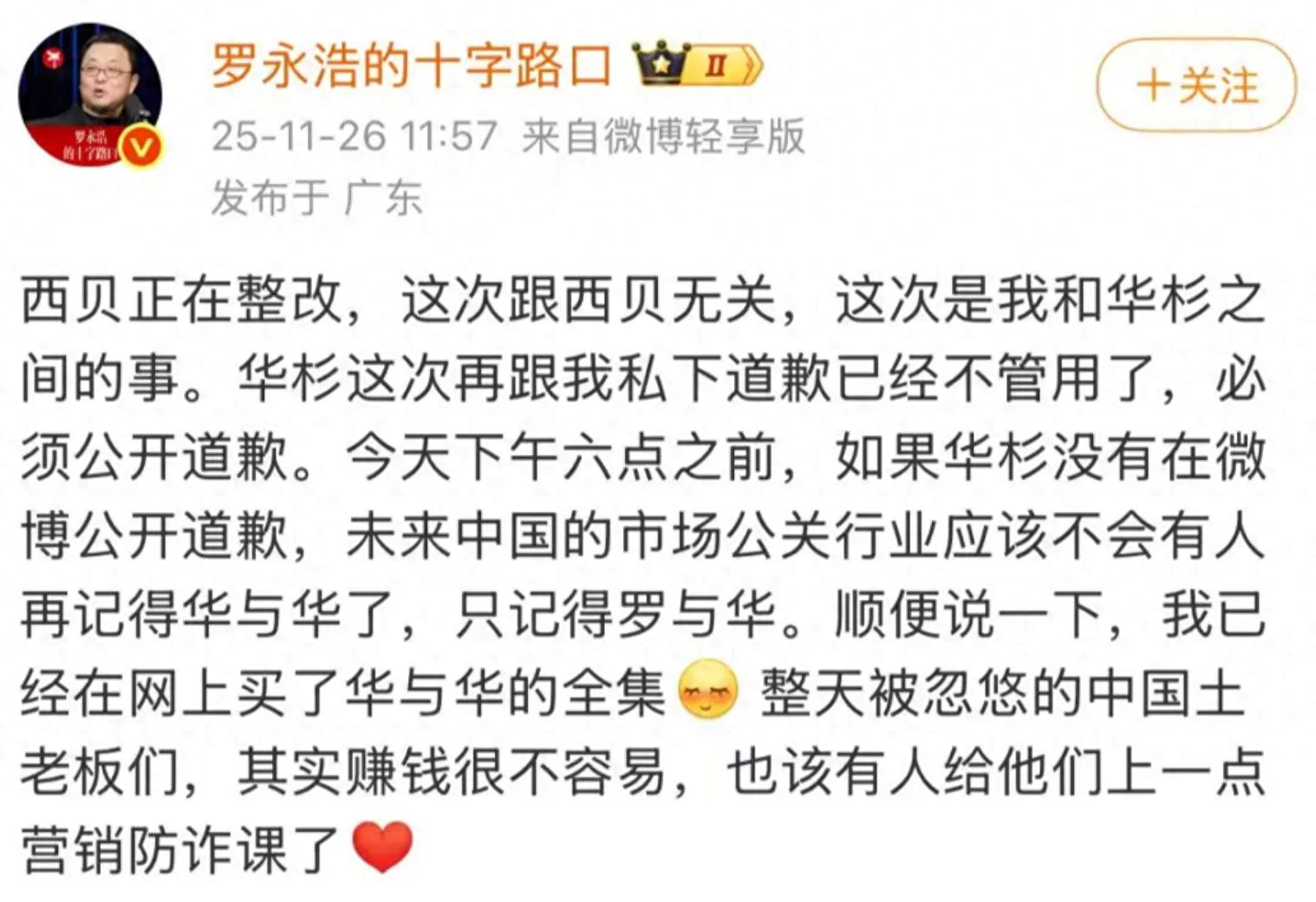 11月26日中午,罗永浩在个人微博置顶发言,要求华杉公开道歉。