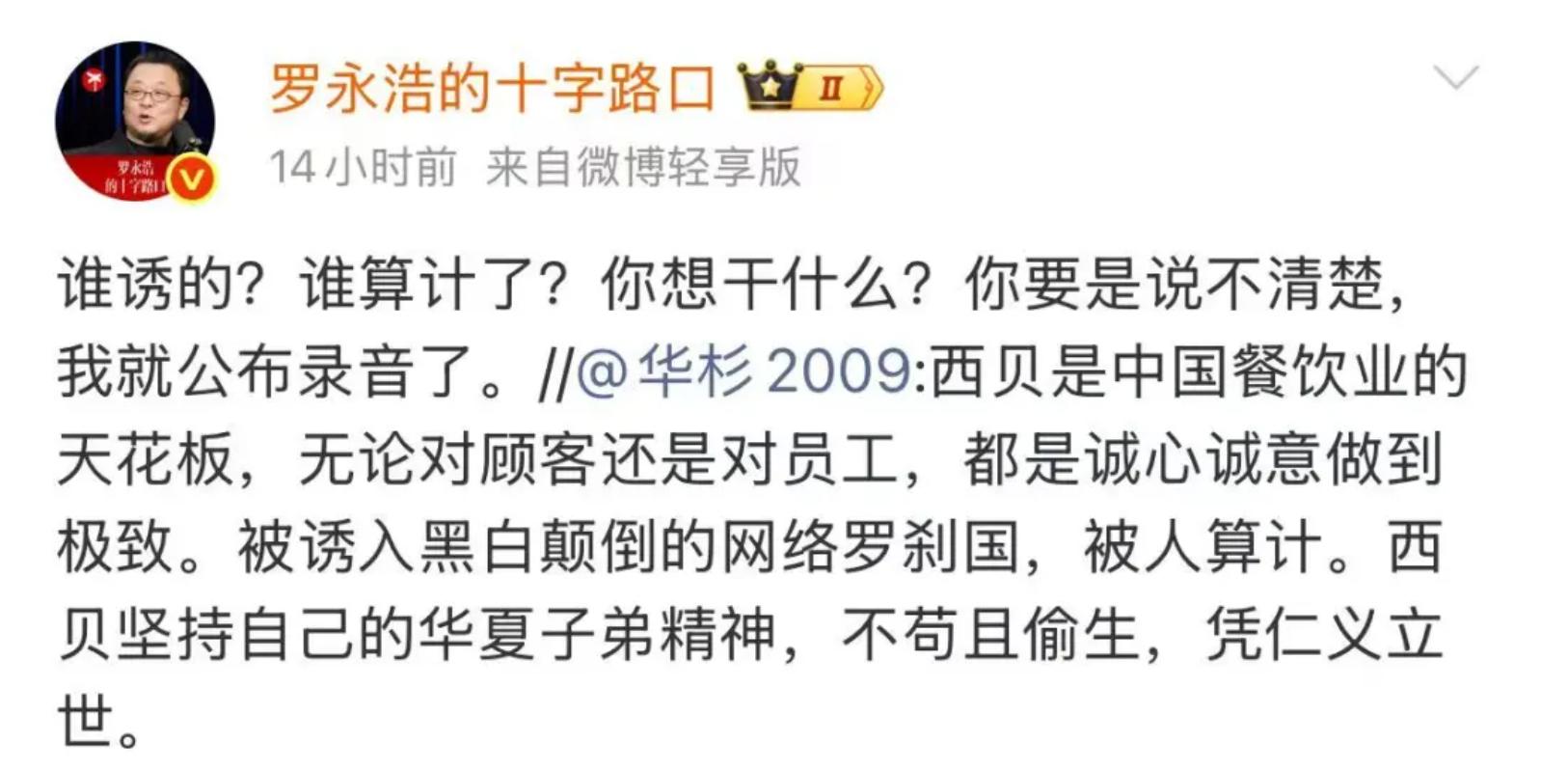 此前,华与华创始人华杉发文称“西贝被算计”。26日凌晨,罗永浩转发该微博并连发三问,并提到将“公布录音”。