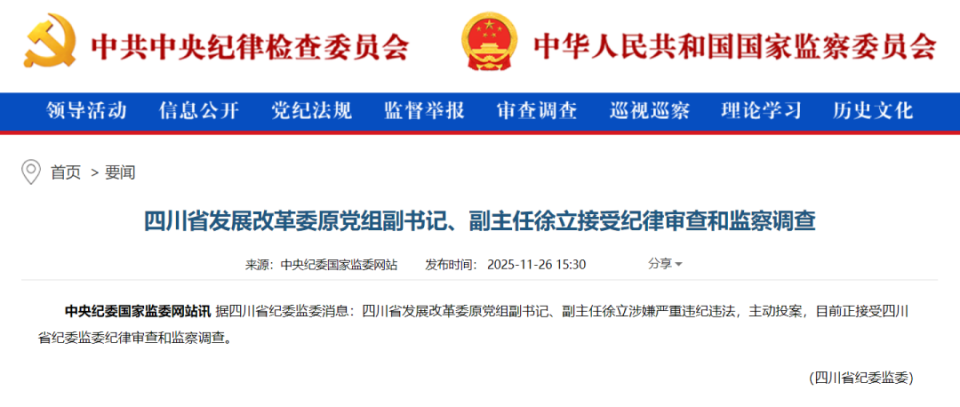 据四川省纪委监委消息:四川省发展改革委原党组副书记、副主任徐立涉嫌严重违纪违法,主动投案,目前正接受四川省纪委监委纪律审查和监察调查。