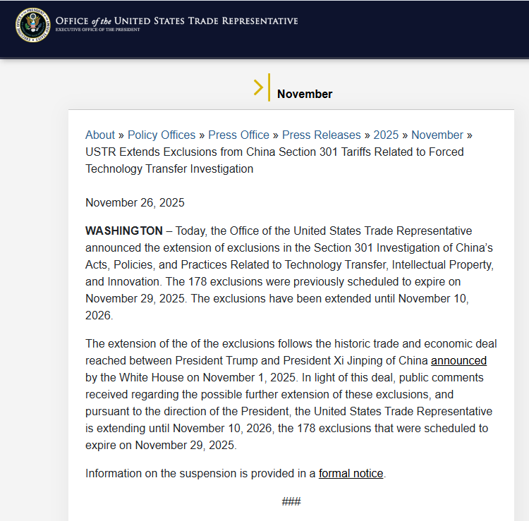 当地时间11月26日,美国贸易代表办公室宣布,将把针对中国技术转让和知识产权问题、依据301条款调查所设立的关税的豁免延长至2026年11月10日。现有豁免条款原定于今年的11月29日到期。