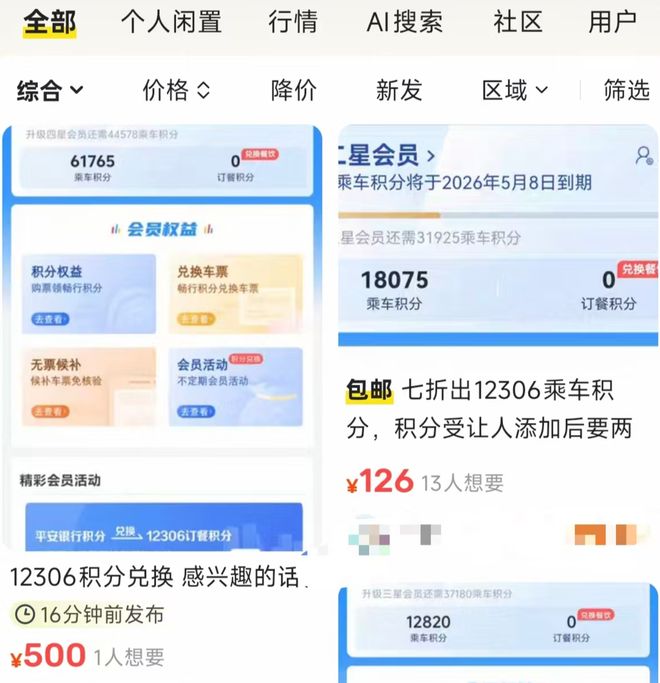 “12306积分七五折购票,提供身份证号60天后可购票”“八折转让12306积分兑换车票,每100积分抵1元,有‘兑’字样的车次都能用”……在二手交易平台上,不少卖家发帖转让12306会员积分。