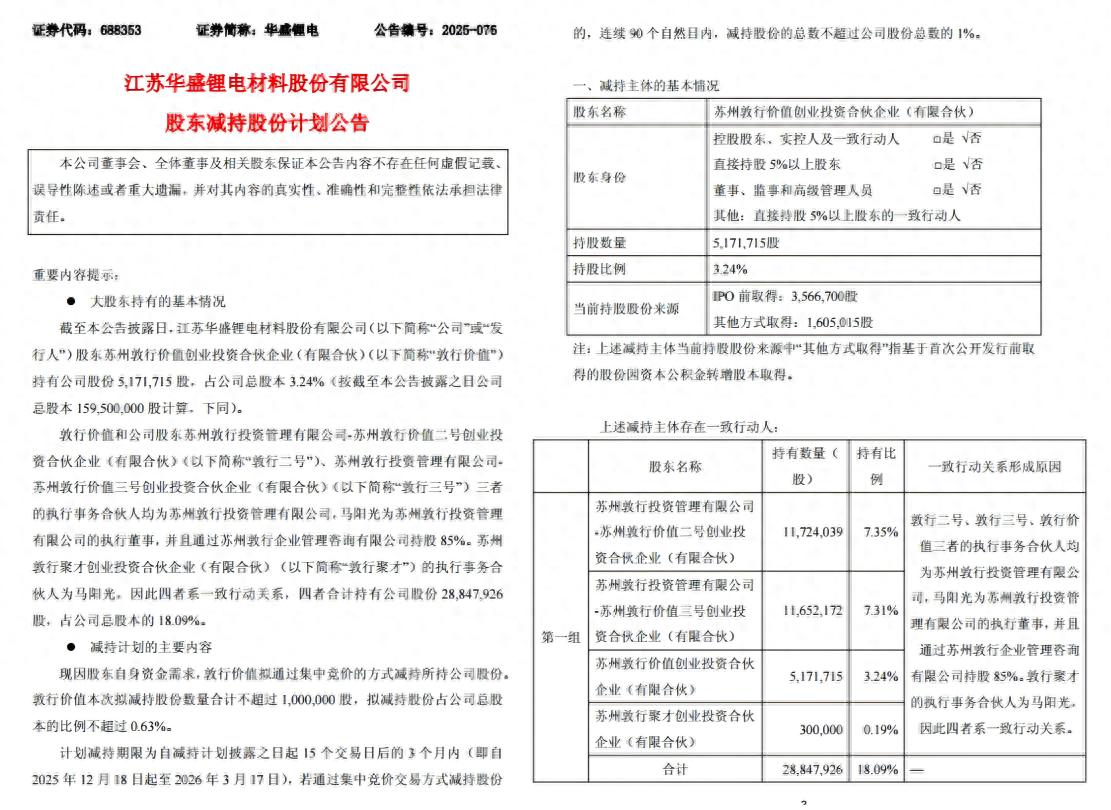 其中,华盛锂电本月初宣布,因“自身资金需求”,苏州敦行聚才创业投资合伙企业(有限合伙)拟通过集中竞价的方式减持所持公司股份,拟减持股份数量合计不超过594500股,占公司总股本的比例不超过0.37%。该计划减持期限为自减持计划披露之日起15个交易日后的 3 个月内,即自2025年11月25日起至2026年2月24日。而同花顺数据显示,2025年11月25日至2025年11月26日,苏州敦行聚才创业投资合伙企业(有限合伙)通过二级市场减持公司股份294500股,参考市值约为2892万元。