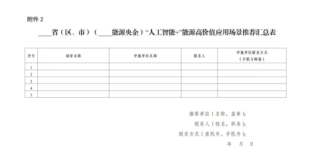 4.请各省级能源主管部门、中央企业于2025年12月29日前将高价值应用场景申报书(详见附件1)、推荐汇总表(详见附件2)盖章件一式三份纸质版及电子版(光盘刻录)寄送至国家能源局科技司。申报场景命名规则为“推荐地区/单位名称-序号-场景名称”(序号与推荐汇总表一致)。