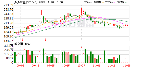 据弗若斯特沙利文报告,按2024年收入计,涛涛车业在全球电动低速车行业排名第二,市占率约8.4%;旗下四大自主品牌覆盖不同市场,2024年自主品牌收入占比超60%。截至2025年11月27日,其A股股价报205.54元,总市值224.14亿元,较2023年上市时增长超250%。