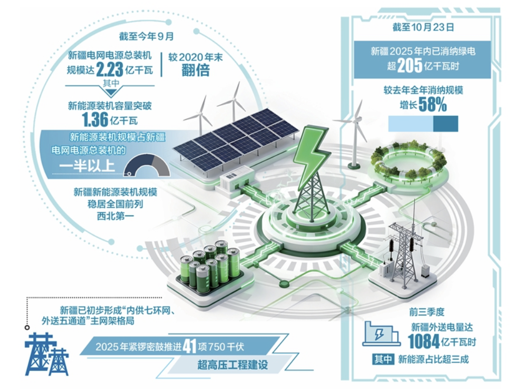 对疆外而言,“疆电外送”通道持续扩容提质,能送出更多绿色电力。