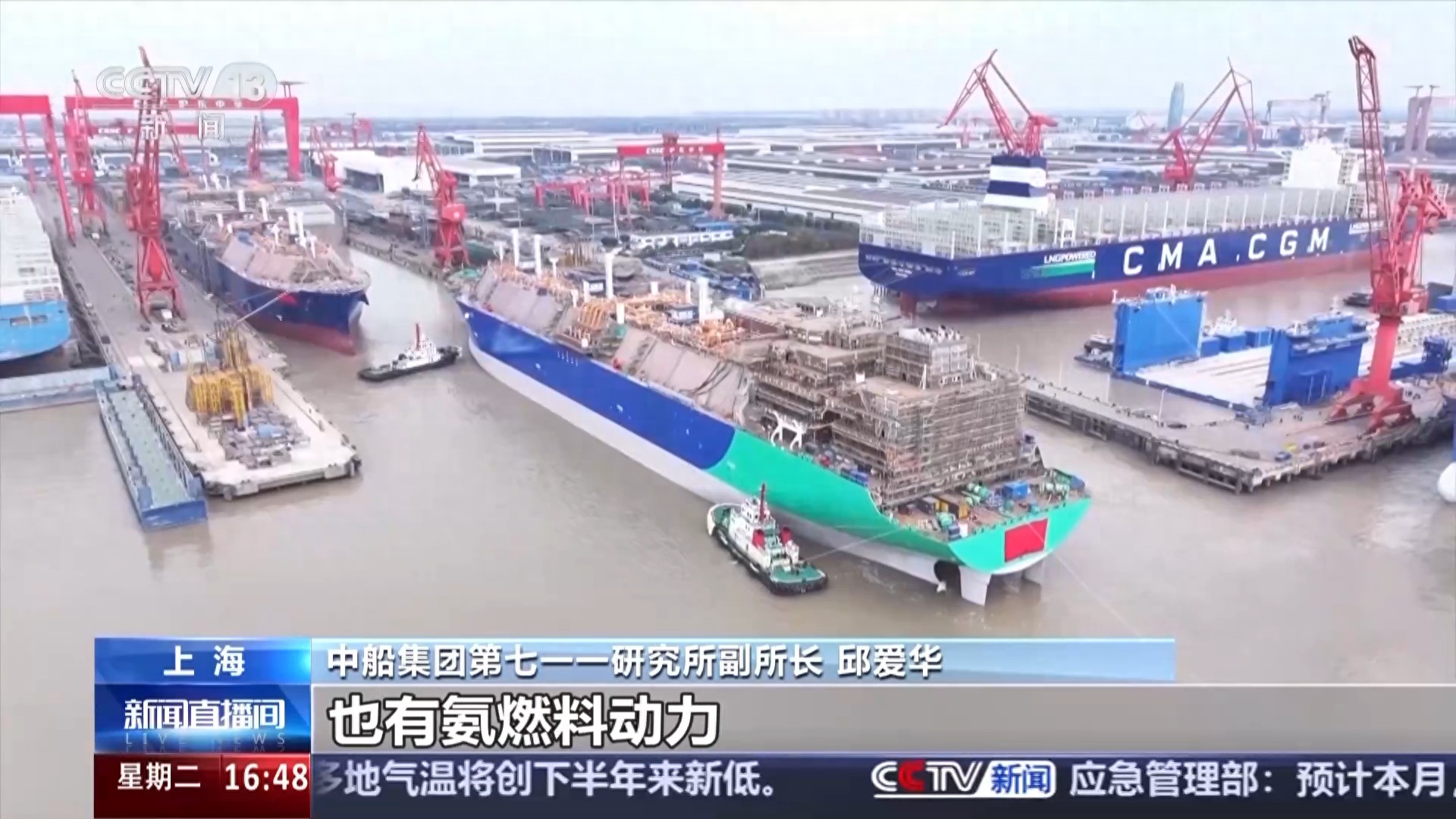 中船集团第七一一研究所副所长 邱爱华:这几年从整体新船的订单来讲,新能源的动力占比也是越来越高,动力的形式也是多样化的。有LNG动力,也有甲醇动力,也有氨燃料动力,同时也有带着储能电池的混合动力,这也是未来船舶动力形势发展方向。