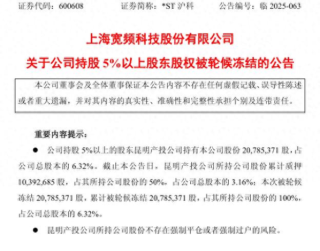 12月2日,*ST沪科(600608)发布公告,持股5%以上的股东昆明产投公司所持公司股份被轮候冻结,冻结股份数量为2079万股,占其所持股份比例100%,占公司总股本的6.32%。
