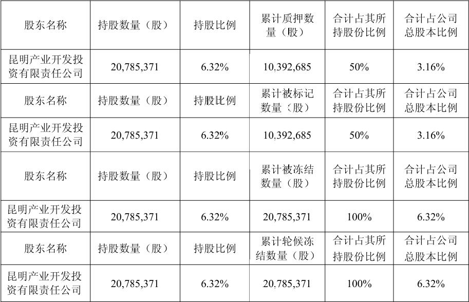 截至公告披露日,昆明产投公司及其一致行动人所持公司股份累计质押、被司法标记、轮候冻结情况如下: