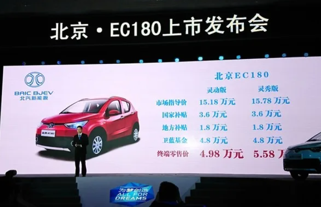 这份辉煌的背后,是政策红利与 B 端市场的双重加持。2009 年“十城千辆”工程启动,作为首都国企的北汽集团顺势布局,成立了新能源相关业务主体,凭借财政补贴,以及北京等地的公共交通(如出租车)订单、共享平台订单等B端业务快速打开局面。以热门车型 EC180 为例,其厂家指导价为15.18万-15.78万元,经国家、地方、厂商多重补贴后,实际售价仅 4.98 万-5.58万元,仅为指导价的 1/3。