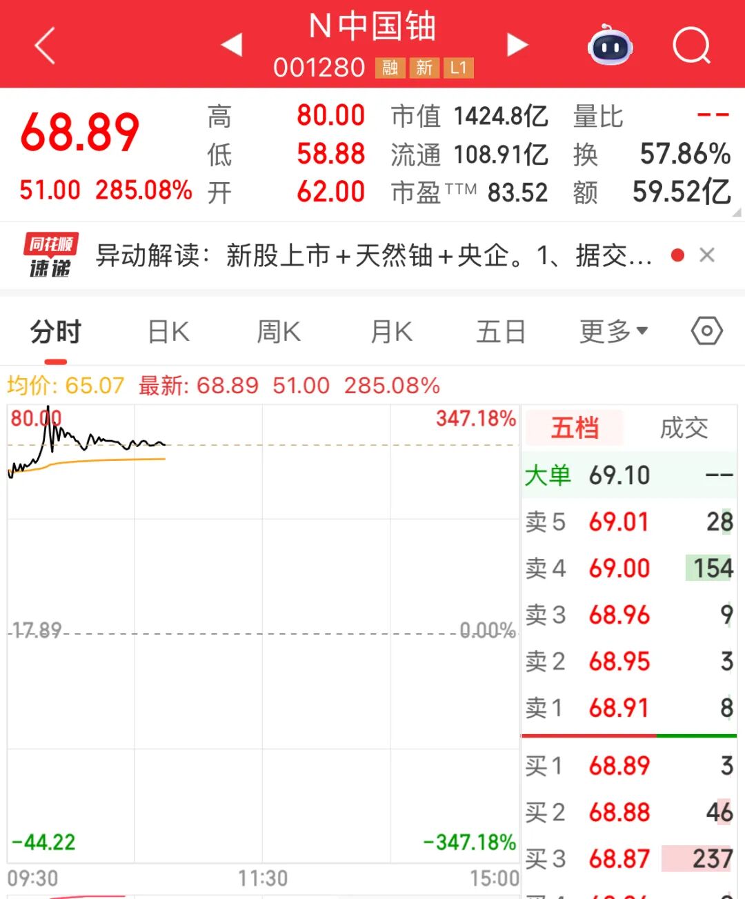 N中国铀今日上市,开盘价62元/股,上涨246.56%,此后股价大幅拉升,开盘半小时内最高涨347.18%。