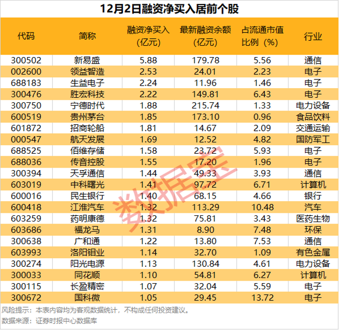 具体到个股,12月2日获融资净买入千万元以上的有412只,其中22股融资净买入额均超1亿元。