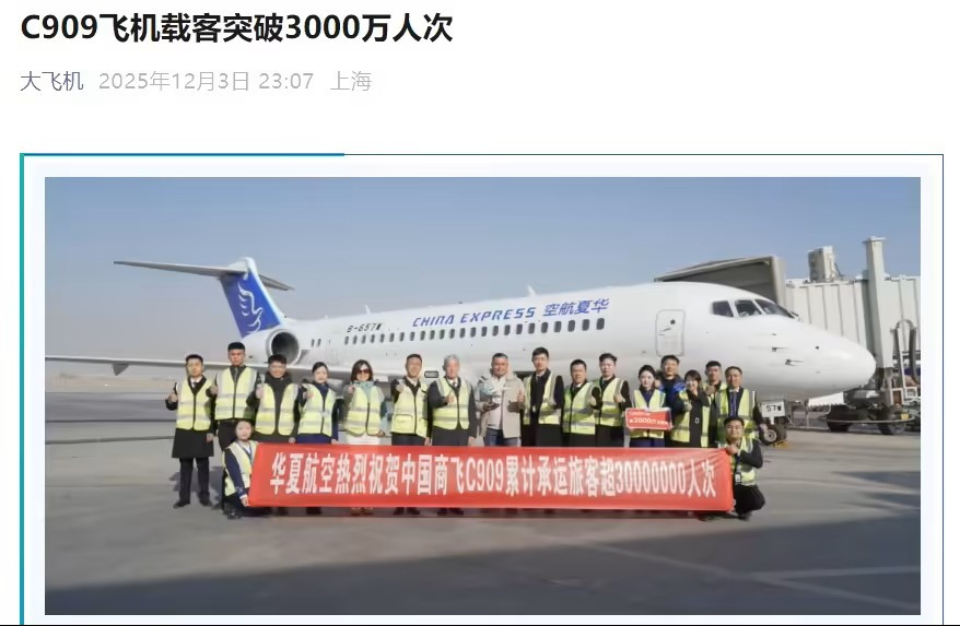 12月4日消息,中国商飞公司“大飞机”公众号近日官宣,华夏航空G54969航班从喀什飞往伊宁的航程中,国产C909涡扇支线客机迎来第3000万名乘客。这一里程碑式突破,标志着我国自主研制的C909飞机正式迈入规模化运营新阶段,为中国民航事业高质量发展注入强劲动力。