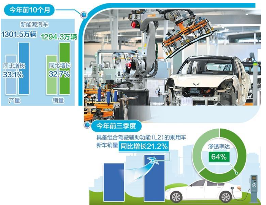 中国汽车工业协会数据显示,今年前10个月,我国汽车产销量分别完成2769.2万辆和2768.7万辆,同比增长均超过10%。其中,新能源汽车产销量分别完成1301.5万辆和1294.3万辆,同比分别增长33.1%和32.7%。