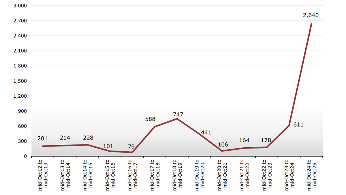 WTO的年度《贸易措施监督报告》显示,2024年10月中旬至2025年10月中旬期间,全球进口额中有26400亿美元都受到关税及其他贸易措施的影响,是前一时期6110亿美元的四倍多。若将类似的出口措施也包括在内,受影响的贸易总额约为29660亿美元,是上一份报告中记录的8880亿美元的三倍多。