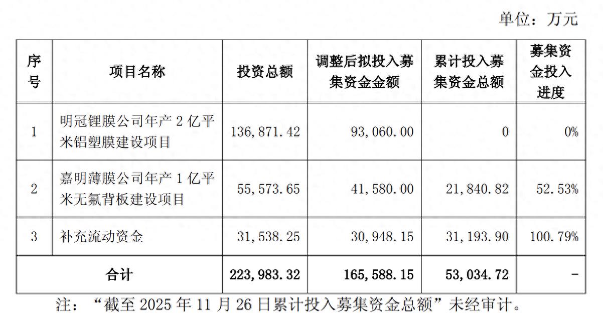 根据公司《明冠新材料股份有限公司2022年度向特定对象发行A股股票募集说明书(注册稿)》披露的募集资金投资项目及募集资金使用计划,截至今年11月26日,“嘉明薄膜公司年产1亿平米无氟背板建设项目”募集资金投入进度为52.53%,“补充流动资金”进度100.79%,而“明冠锂膜公司年产2亿平米铝塑膜建设项目”进度为零。