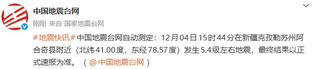 中国地震台网自动测定:12月04日15时44分在新疆克孜勒苏州阿合奇县附近(北纬41.00度,东经78.57度)发生5.4级左右地震,最终结果以正式速报为准。