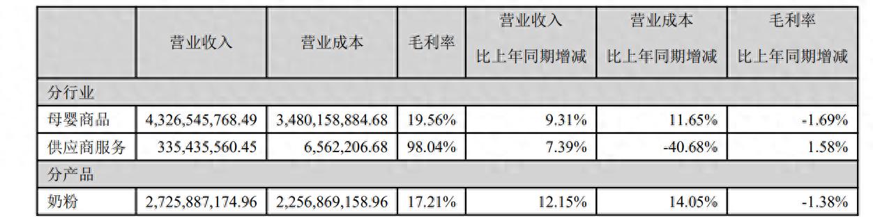 分行业来看,母婴商品是孩子王的主要营收来源。今年上半年,该公司母婴商品营业收入同比增长9.31%至43.27亿元,营收占比约88.1%,毛利率同比下滑1.69%至19.56%;供应商服务实现营业收入3.35亿元,毛利率同比增长1.58%。