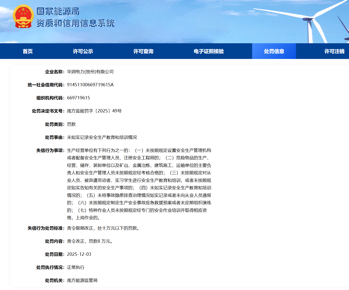 近日,国家能源局资质和信用信息系统信息显示,华润电力(贺州)有限公司因未如实记录安全生产教育和培训情况。被南方能源监管局责令改正并罚款8 万元。