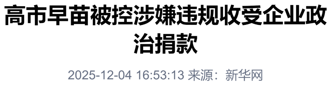 今年10月高市就任首相后任命的高级官员中,有7人涉及自民党“黑金”丑闻。日本舆论认为,高市在“黑金”问题上态度含糊,无意从根本上改正。