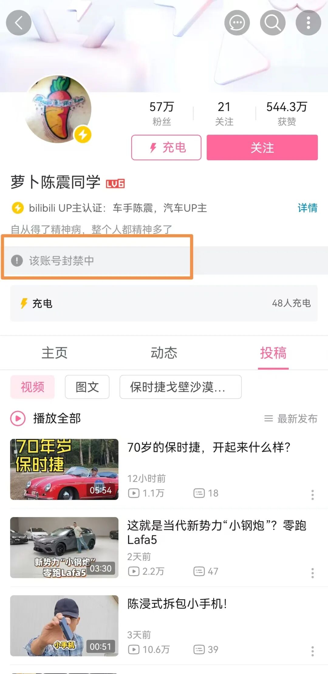 “红星新闻”微信公号12月5日消息,12月4日深夜,知名车评人陈震多个社交媒体平台账号被禁言。此前,其开劳斯莱斯闪灵出车祸被通报,近期有言论引质疑。
