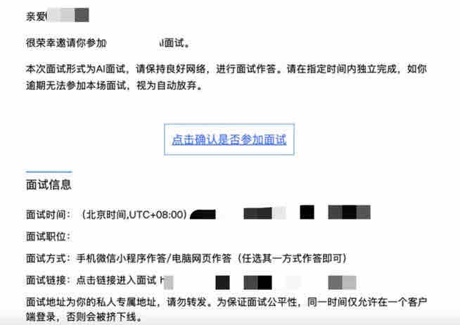 同时,AI面试似乎并没有正视应届生们的时间精力成本。就连AI面试通知也是企业通过邮箱自动发送,没有给到应届生们在艰难的求职市场所渴求的尊重。