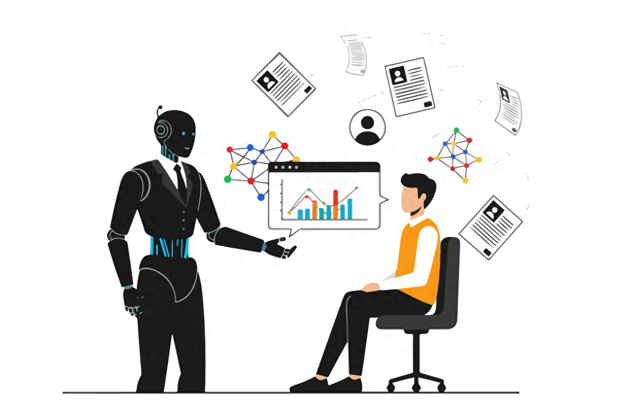 人工智能驱动的招聘流程,机器人面试官在分散的简历和网络图表机器人中向候选人展示数据。图源:IC photo
