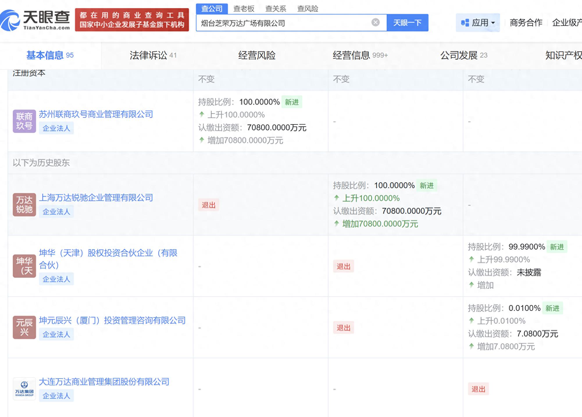 据天眼查信息,12月2日,烟台芝罘万达广场有限公司发生工商变更。股东层面,新华保险旗下的坤华(天津)股权投资合伙企业(有限合伙)、坤元辰兴(厦门)投资管理咨询有限公司正式退出,新增上海万达锐驰企业管理有限公司,后者持股比例达100%。公开资料显示,上海万达锐驰企业管理有限公司成立于2023年,由大连万达商业管理集团股份有限公司100%全资持股。