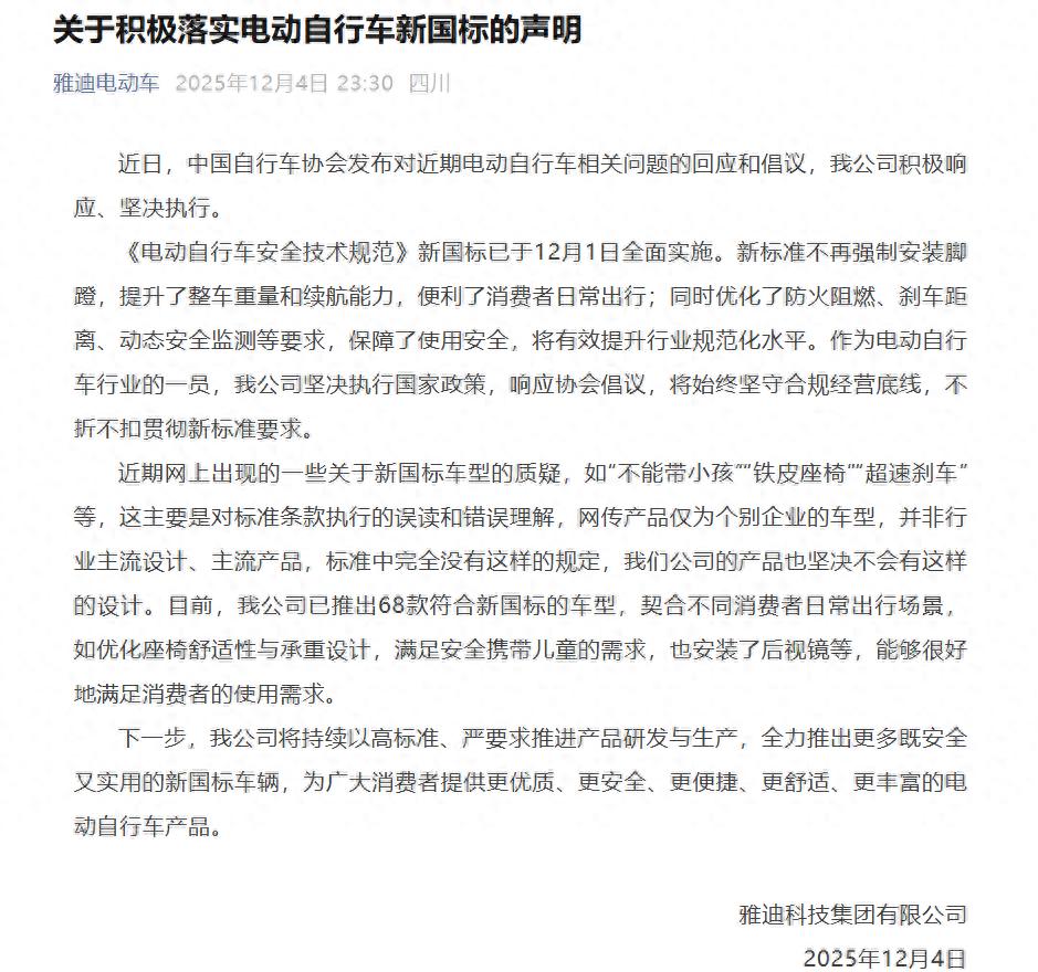 12月4日,中国自行车协会发文《中国自行车协会对近期电动自行车相关问题的回应和倡议》: