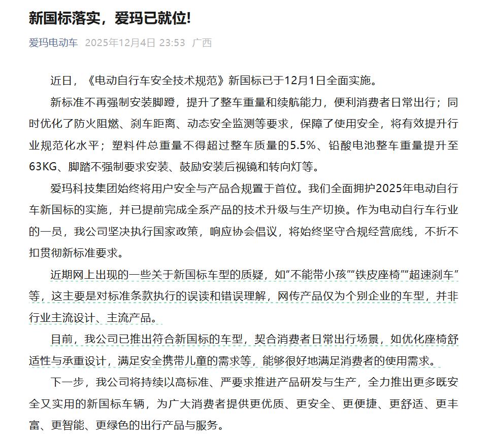 爱玛电动车发文《新国标落实,爱玛已就位!》: