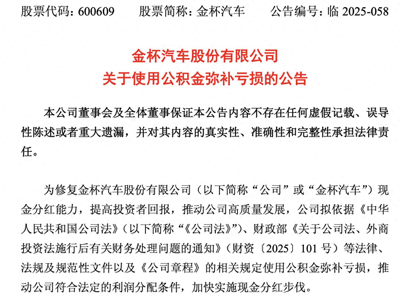 12月4日晚,金杯汽车(600609)公告,拟使用公积金弥补亏损,加快实施现金分红步伐。
