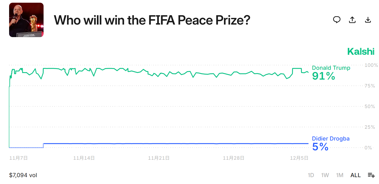鉴于国际足联主席因凡蒂诺在今年10月诺贝尔和平奖颁发前一天还在公开发声支持特朗普拿奖,舆论普遍认为这个奖是给特朗普“定制”的。在预测平台Kalshi上,特朗普得奖的概率高达91%。