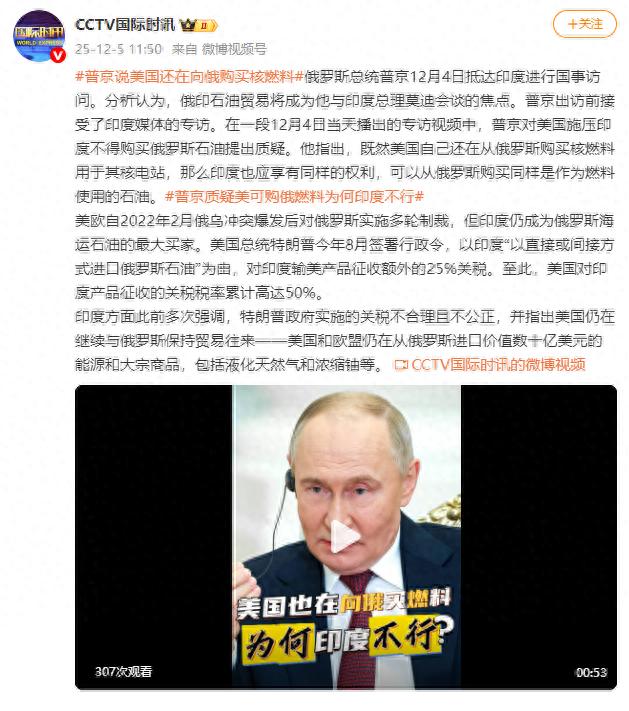俄罗斯总统普京12月4日抵达印度进行国事访问。分析认为,俄印石油贸易将成为他与印度总理莫迪会谈的焦点。普京出访前接受了印度媒体的专访。在一段12月4日当天播出的专访视频中,普京对美国施压印度不得购买俄罗斯石油提出质疑。他指出,既然美国自己还在从俄罗斯购买核燃料用于其核电站,那么印度也应享有同样的权利,可以从俄罗斯购买同样是作为燃料使用的石油。