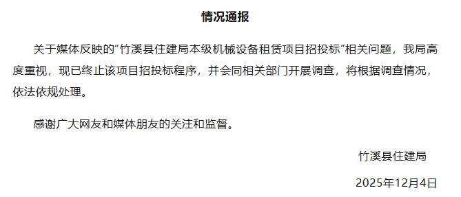 12月4日,湖北竹溪县住建局发布情况通报称,关于媒体反映的“竹溪县住建局本级机械设备租赁项目招投标”相关问题,该局高度重视,现已终止该项目招投标程序,并会同相关部门开展调查,将根据调查情况,依法依规处理。