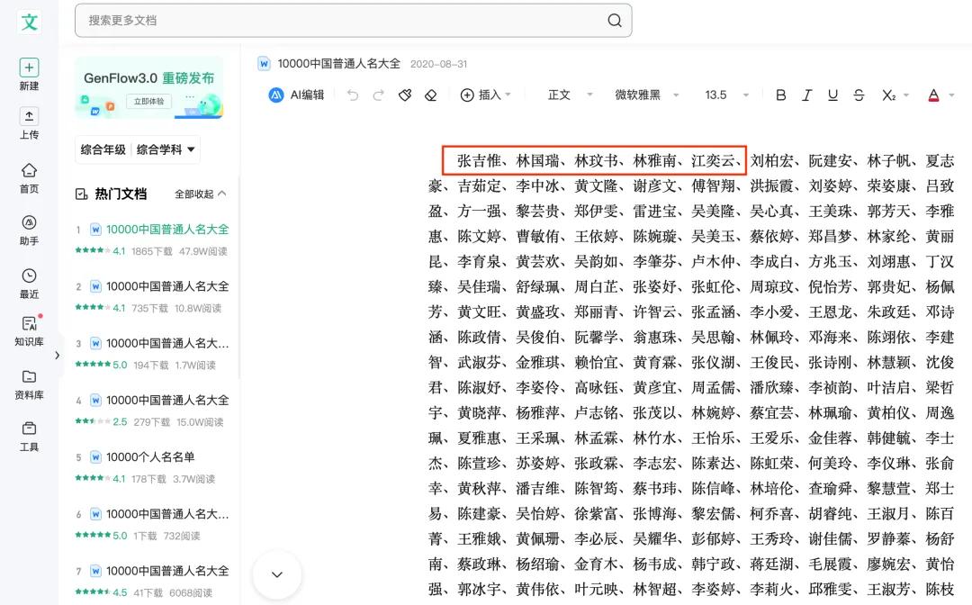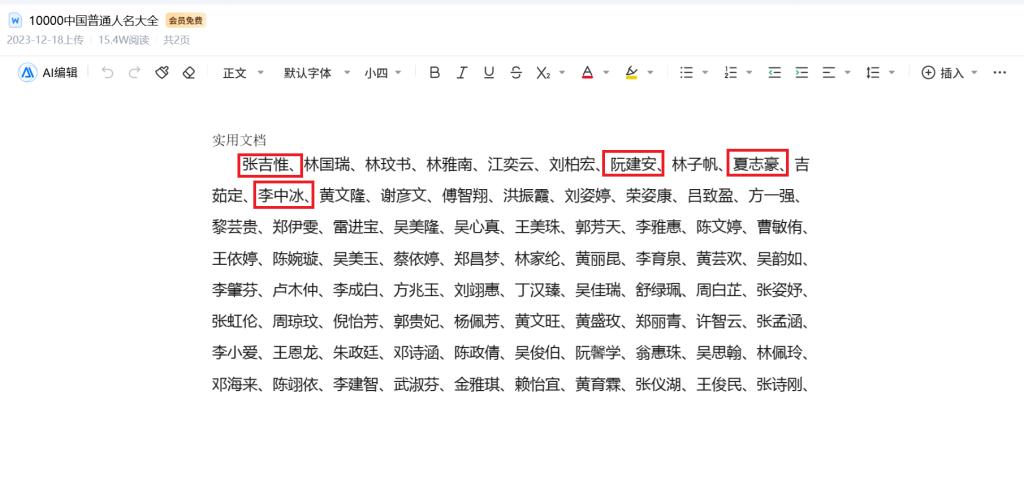 上述公告中,评审小组成员名单一栏显示:张吉惟、林国瑞、林玟书、林雅南、江奕云。这5个名字与顺序均与百度文库《10000中国普通人名大全》中列出的前五个人名完全一致。