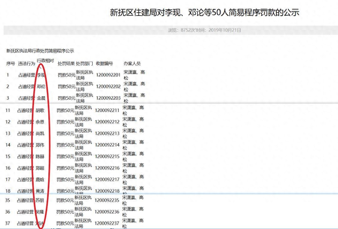 12月4日,有网友发现,辽宁抚顺新抚区住建局于2019年10月21日公示的一占道经营处罚名单疑存猫腻,其上的名字不但均为“姓氏+单名”的两字结构,而且还不少与知名艺人重名,如李现、金晨、董璇、杨颖、胡歌、孙俪、鹿晗等。另有一些被处罚人员的名字,虽然与知名艺人名字不是完全重合,也仅仅是一字之差,例如“苏朋”“吴隆”“林志”等。