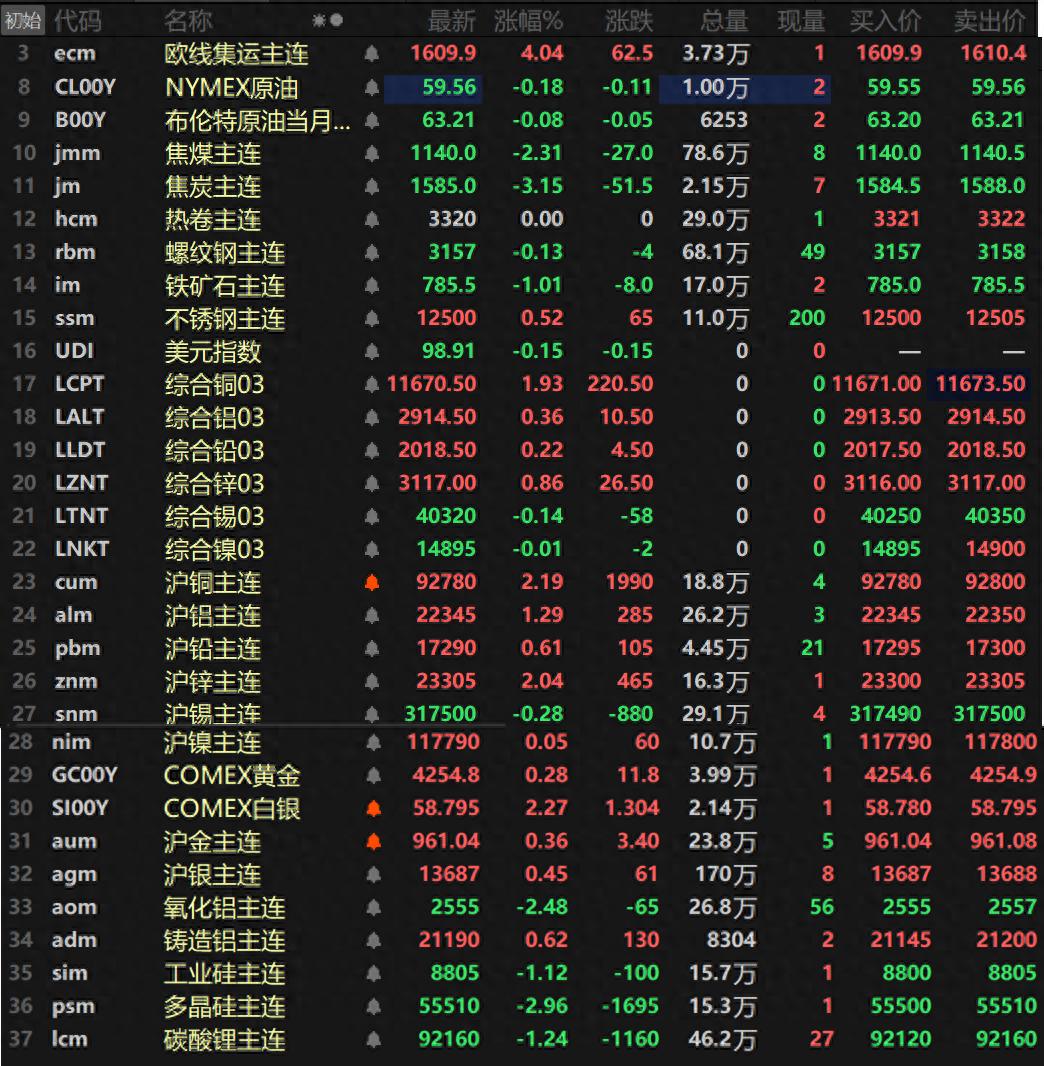 此外,碳酸锂主连跌1.24%,录得四连跌。多晶硅跌2.96%,工业硅跌1.12%,欧线集运主连涨4.04%报1609.9。