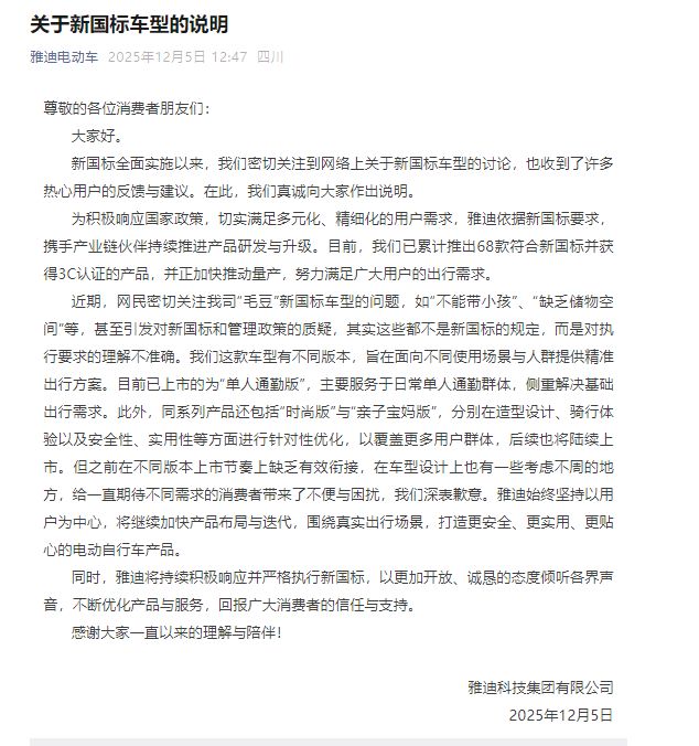 12月5日,雅迪科技集团有限公司(以下简称“雅迪”)解释其部分新国标车型引发的争议,比如“不能带小孩”“缺乏储物空间”等,称这些问题并非新国标规定,而是公司对执行要求的理解不准确。