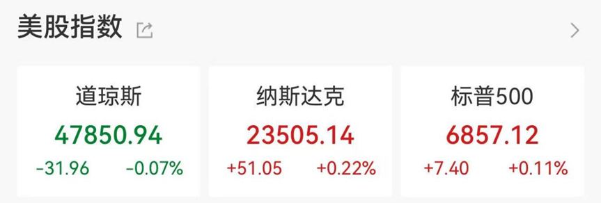 美东时间12月4日周四,美股三大指数涨跌不一。截至收盘,标普500指数涨0.11%,报6857.12点;纳指涨0.22%,报23505.14点;道指跌0.07%,报47850.94点。