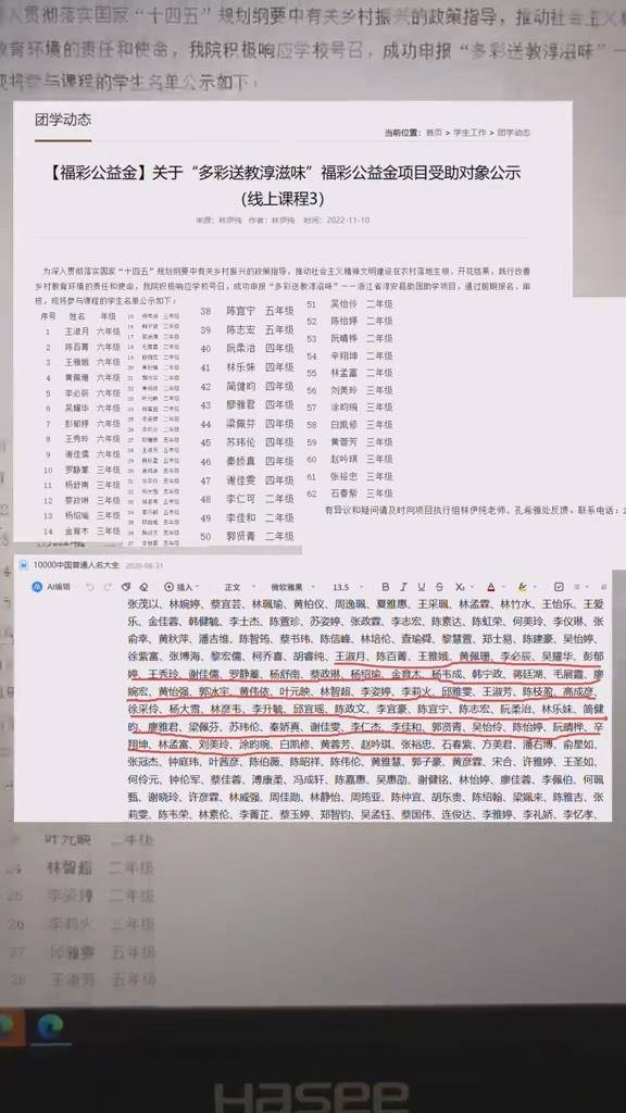该网友发布视频称,其发现杭州师范大学人文学院官网2022年11月公示的一份“福彩公益金项目受助对象”名单中,所使用的姓名来自2020年发布的百度文库10000个人名大全,姓名和顺序一模一样。该网友还发现,该学院官网公示的其他“福彩公益金项目受助对象”名单中,也存在大量使用上述人名大全名录中姓名的情况。质疑存在作假的问题。