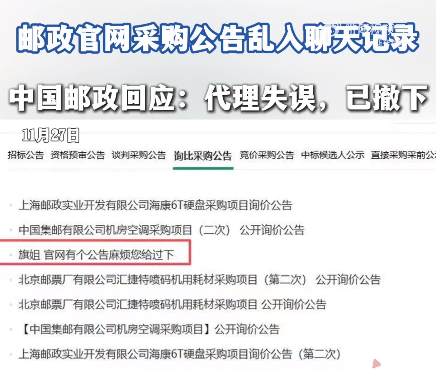 11月27日,中国邮政集团有限公司官网出现一条异常的采购公告——其标题并非正式的项目名称,而是一句疑似来自聊天记录的对话:“旗姐,官网有个公告麻烦您给过下”。这一非常规的标题迅速引起网友关注,被指“将内部沟通内容误当作公告标题”。