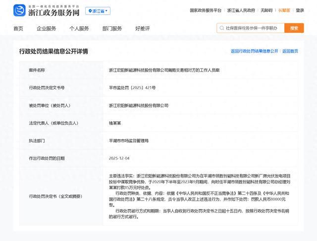 浙江宏阳新能源科技股份有限公司因贿赂交易相对方的工作人员案,被平湖市市场监督管理局行政处罚。