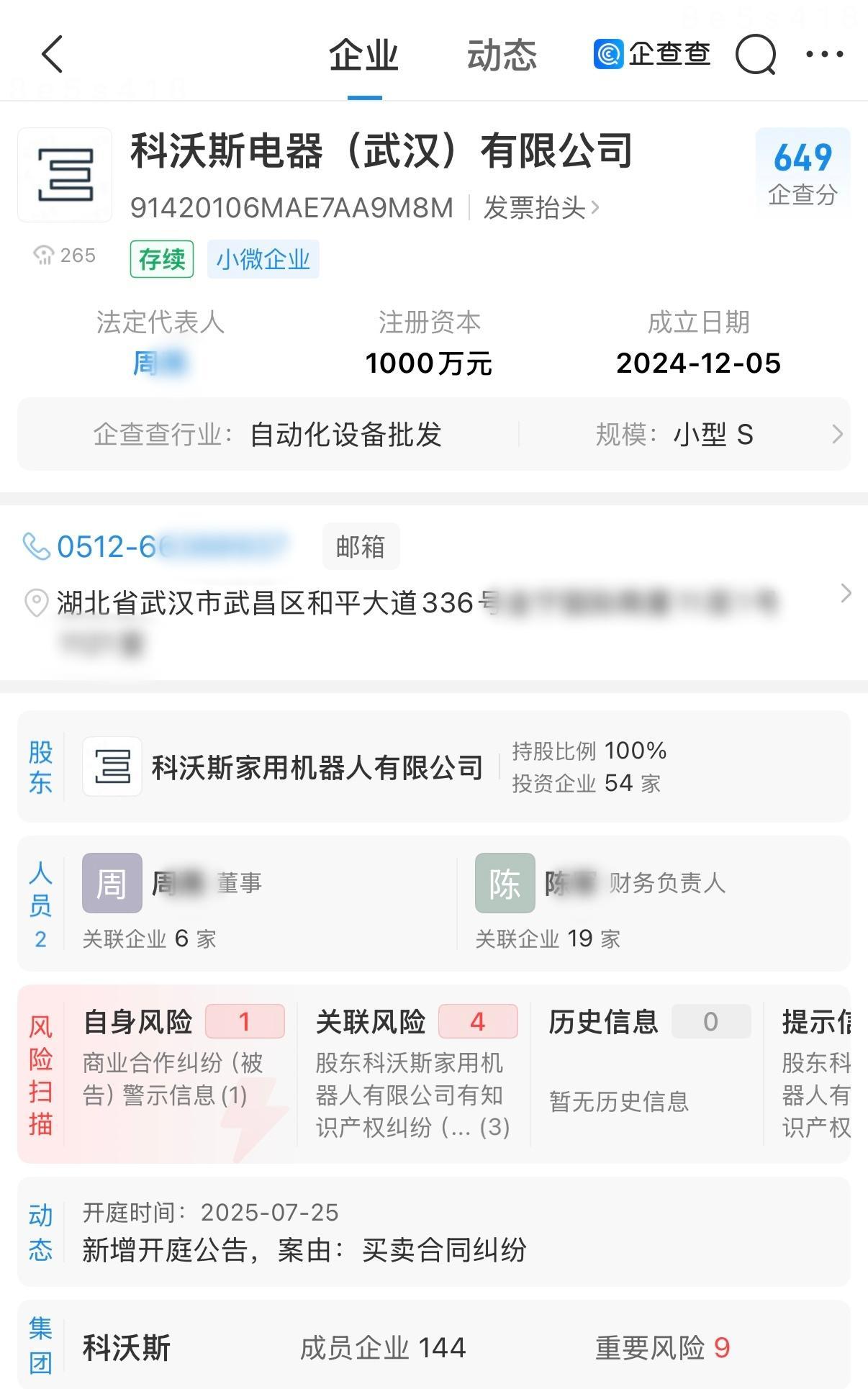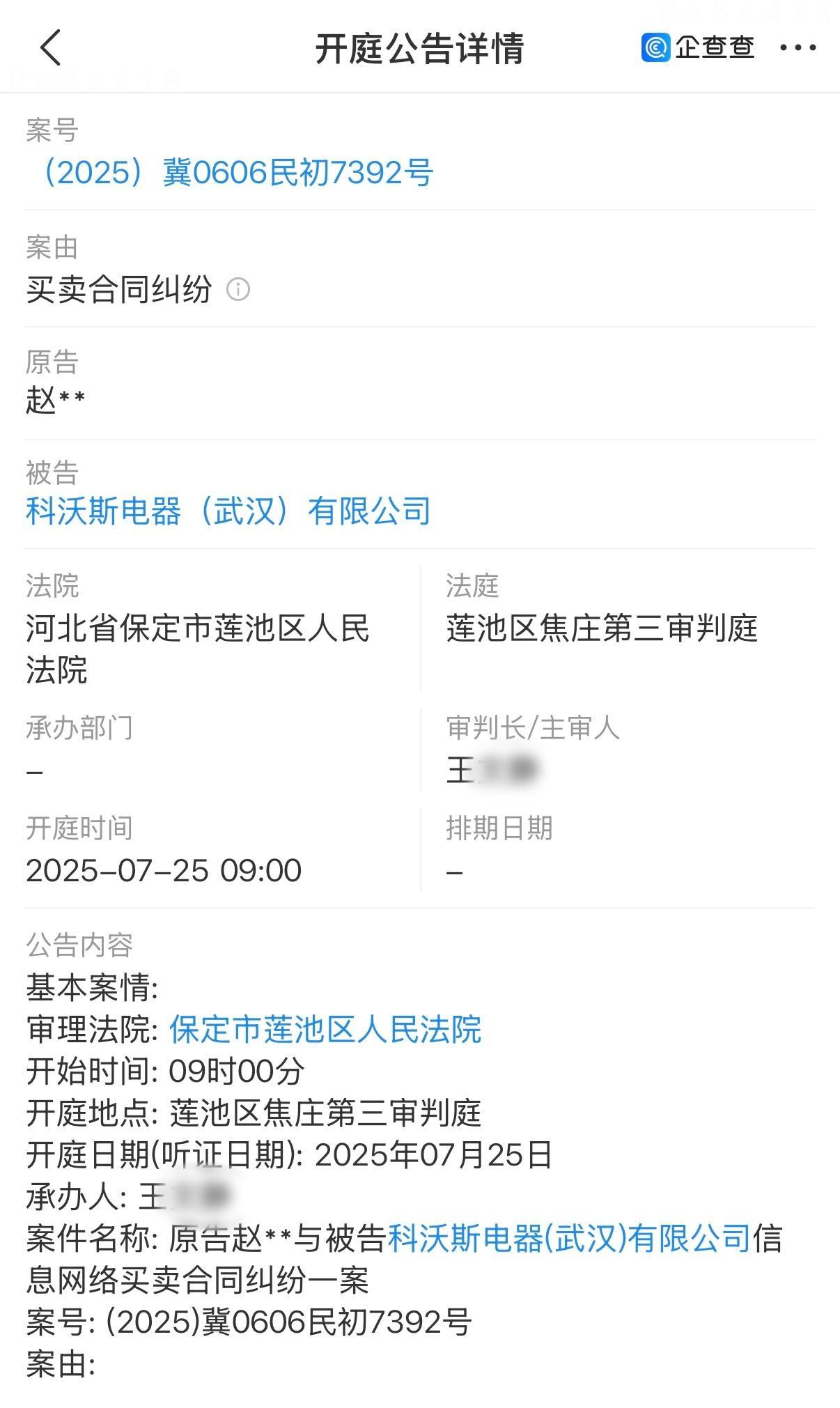值得注意的是,企查查显示,科沃斯电器(武汉)有限公司已涉及司法纠纷,2025年7月25日,河北省保定市莲池区人民法院开庭审理了“赵某某与科沃斯电器(武汉)有限公司信息网络买卖合同纠纷”(案号:(2025)冀0606民初7392号)。