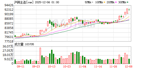 国内沪铜期货同样保持强势格局。截至12月5日,沪铜主力2601合约盘终报收于9.238万元/吨;12月4日,该合约创出上市以来新高,达到9.291万元/吨。