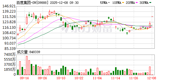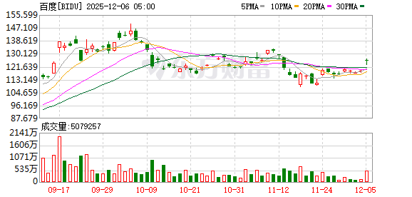 截至12月5日收盘,百度港股每股报121.6港元,涨幅为5.01%,最新市值为3344亿港元。