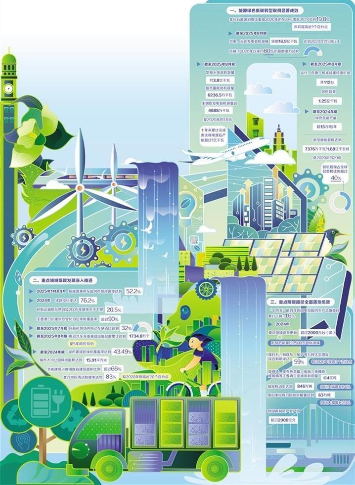 非化石能源消费比重由2020年的16.0%增至2024年的19.8%;2025年1月至9月,新能源乘用车国内市场渗透率达到52.2%;“十四五”前四年我国单位国内生产总值能耗累计下降11.6%……作出碳达峰碳中和重大宣示五年来,面对复杂多变的国内外形势,在党中央坚强领导下,我国牢固树立和践行绿水青山就是金山银山的理念,采取有力行动、付出艰苦努力,推动绿色低碳转型取得历史性成就。